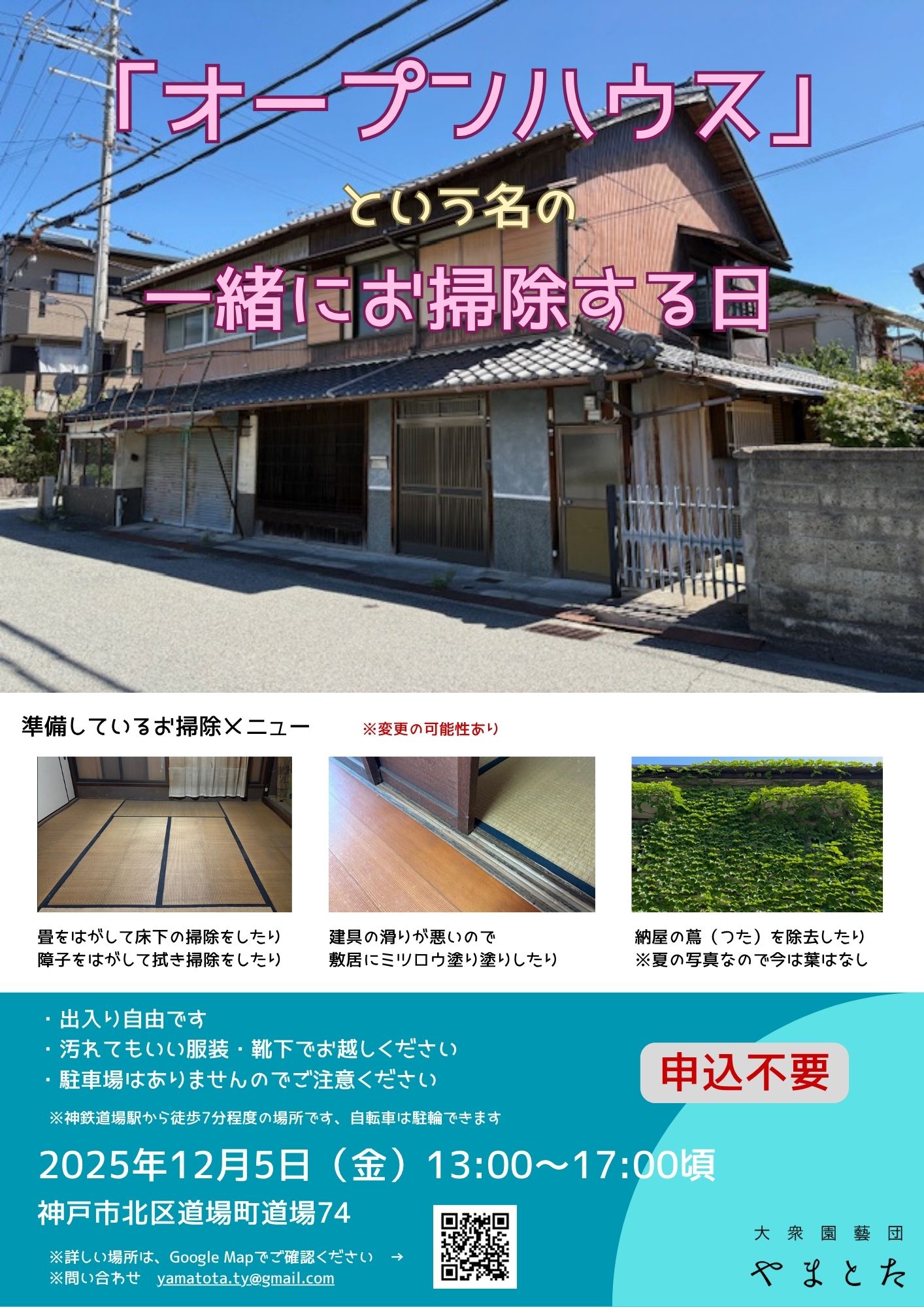 改修はまだこれからですが、このたび、やまとたに興味のある方や近隣にお住まいの方に向けてオープンハウスを開催することにしました。単に見学するだけでなく、お掃除メニューも用意していますので、昔ながらの建物を一緒にお掃除してみませんか?