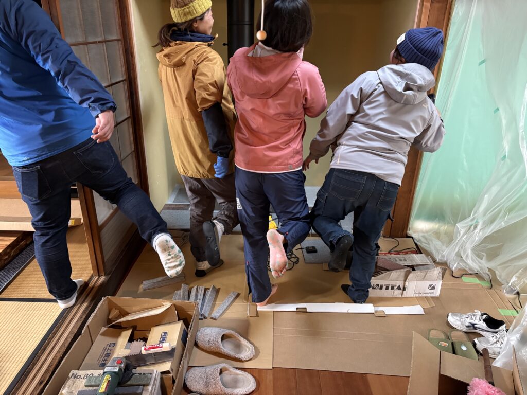 3月は台所の塗装体験も合わせて実施。塗料を混ぜて作ったので若草色を目指したのにえらい明るい色(若竹色?)になってしまった、、、という誤算もありましたが、結果、とても綺麗な壁の色になりました。参加者の皆さんは靴下が汚れても楽しそうに塗ってくれました。子ども達はジェンガや押し入れ個室で遊んでくれて使い方の幅も広がります。
